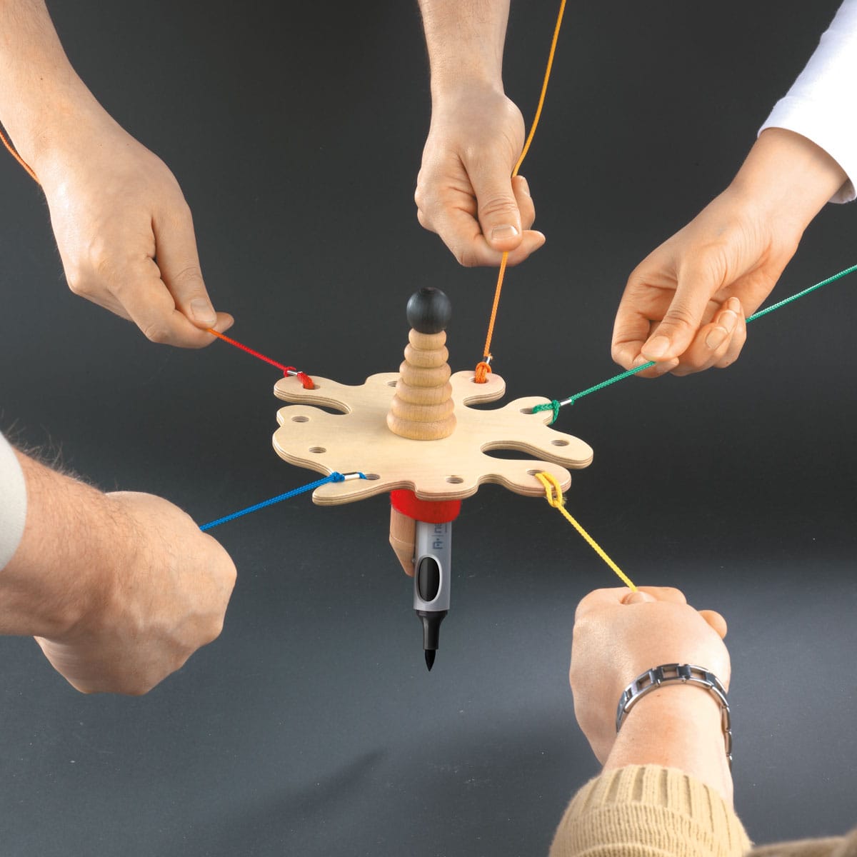Dynamisch-kreatives Zeichenspiel für Gruppen bis zu 10 Personen. Fördert gleichzeitig Geschicklichkeit und soziale Kompetenz und aktiviert zum gemeinschaftlichen Handeln. Lieferumfang: StrippenZieher aus Buche-Formholz, umfassende Anleitung für verschiedene Seminarspiele, 10 farbige Schnüre und ein Wachsmalstift