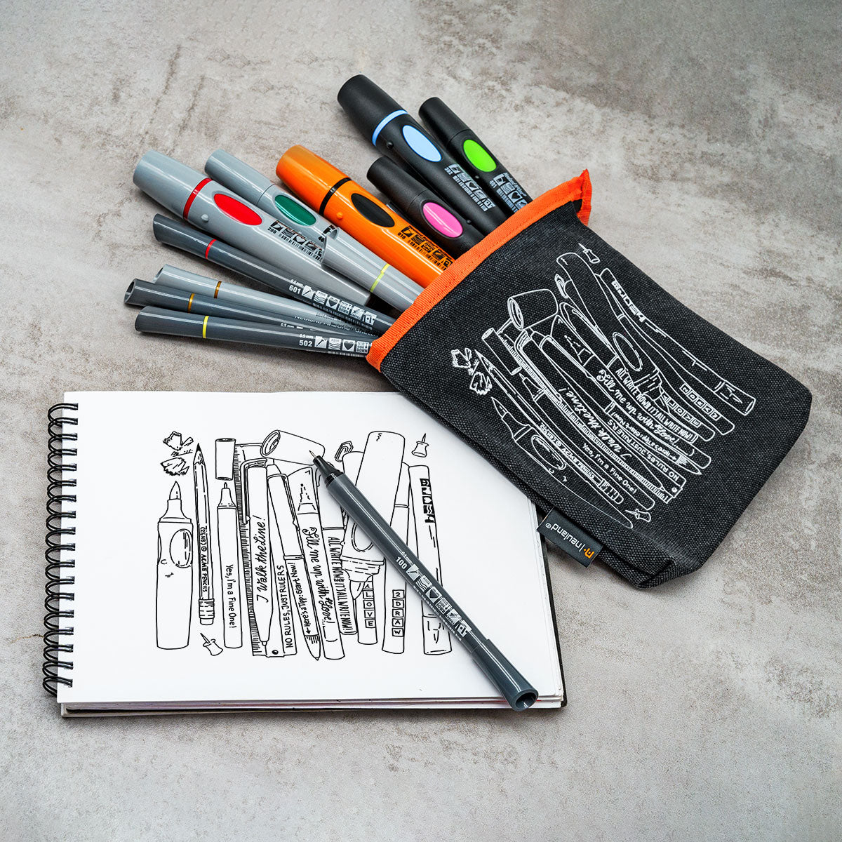 Schickes Mäppchen aus strapazierfähiger Baumwolle mit Motivdruck und Reißverschluss für bis zu 20 Neuland No.One®-Marker oder 9 Neuland BigOne®-Marker - Lieferung ohne Inhalt. Material: schwarze Baumwolle mit Reißverschluss Maße: B 15,5 x H 19 x T 3 cm