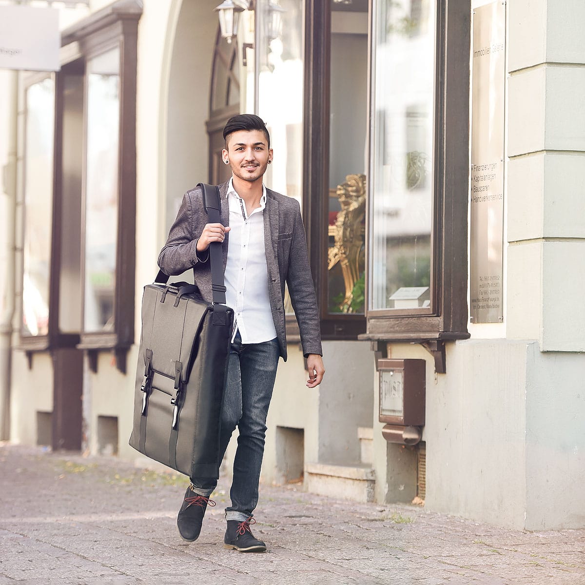 UrbanBag - Tasche im Messenger Style für FlipChart Urban Ausführung: - Hauptfach mit 5 mm PE-Schaum gepolstert, Überschlag mit Steckschlössern - Gurt für Steckschlösser mit aufgenähtem Reflexband - auf der Front befindet sich eine Eingrifflasche zum Festhalten - ebenfalls auf der Front zwei Streifen Hypalon - 2 Handtragegriffe mit LKW-Plane und beidseitig längenverstellbarer Umhängegurt mit Schulterpolster aus matter LKW-Plane - Ecken mit Hypalon verstärkt Material außen: LKW-Plane schwarz-matt Material innen: Polyester 600 d Maße: B 85 x H 65 x T 11 cm