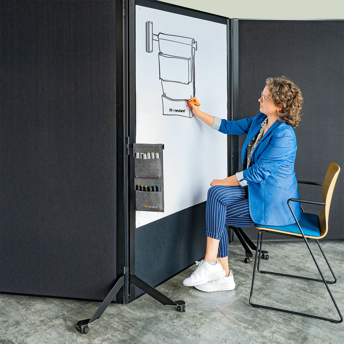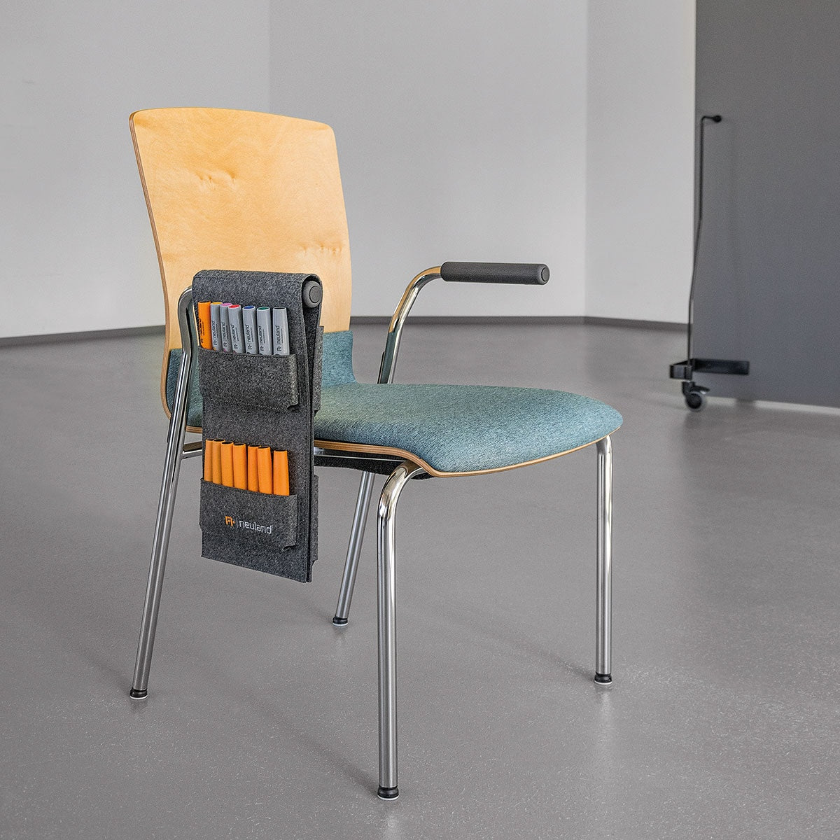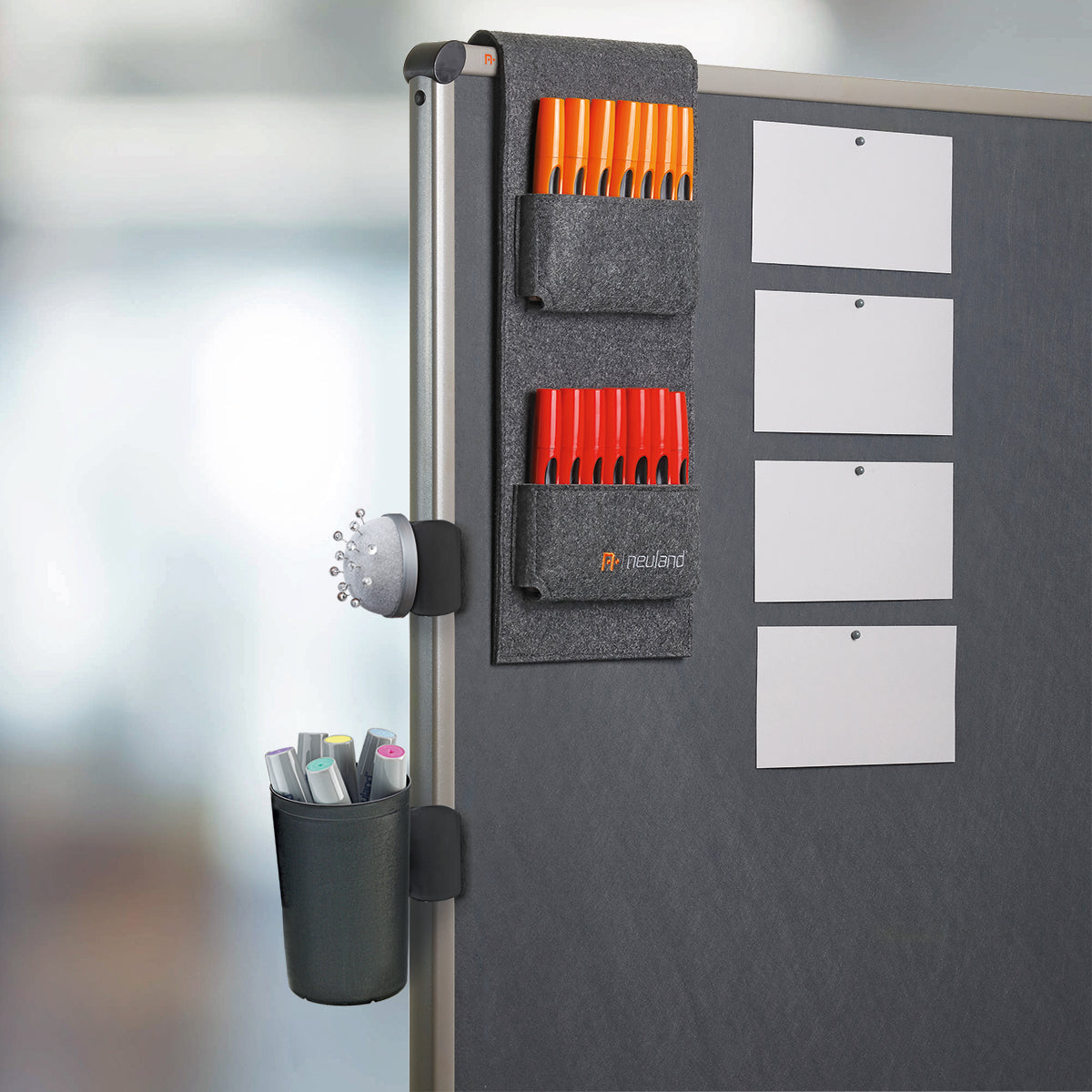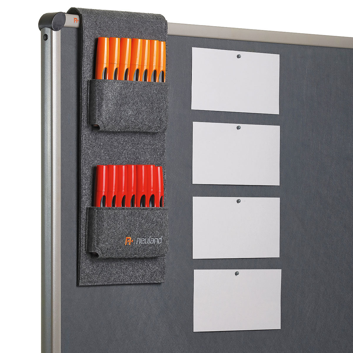 Die clevere Materialtasche für die Neuland Werkwand®, Pinnwände und FlipCharts und viele weitere Einsatzgebiete. Material: Polyesterfilz, grau, innen mit PE-Platte versteift, Taschenbeuge rutschhemmend 8 Magnete innen verarbeitet Ausführung: 2 Einstecktaschen vorne ohne Laschen (Größe: ca. 12 x 17 x 2 cm) 2 Einstecktaschen hinten mit Laschen für jeweils 7 Marker (Größe: ca. 7,5 x 16 x 1,5 cm) Abmessungen: ca. 41 x 18 cm
