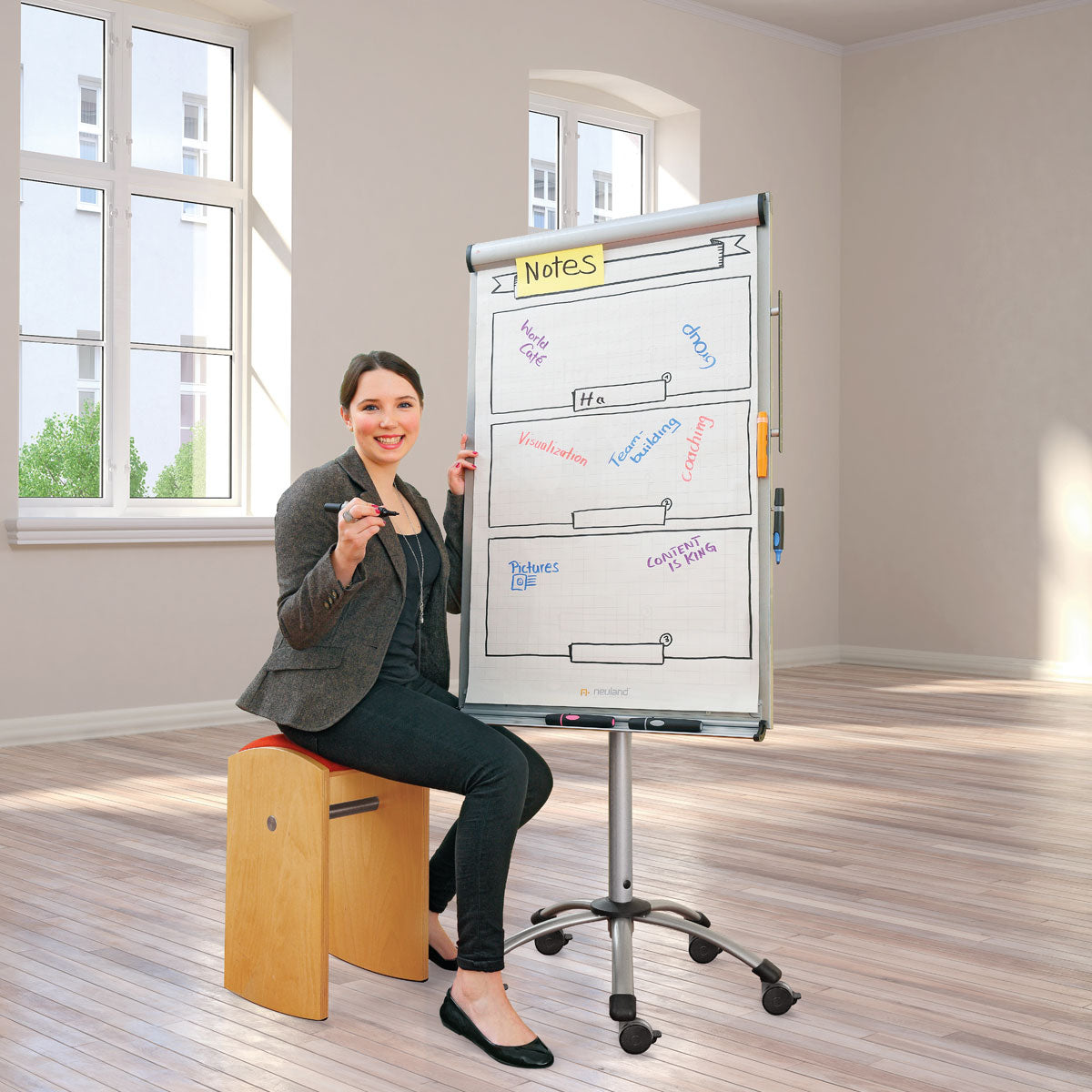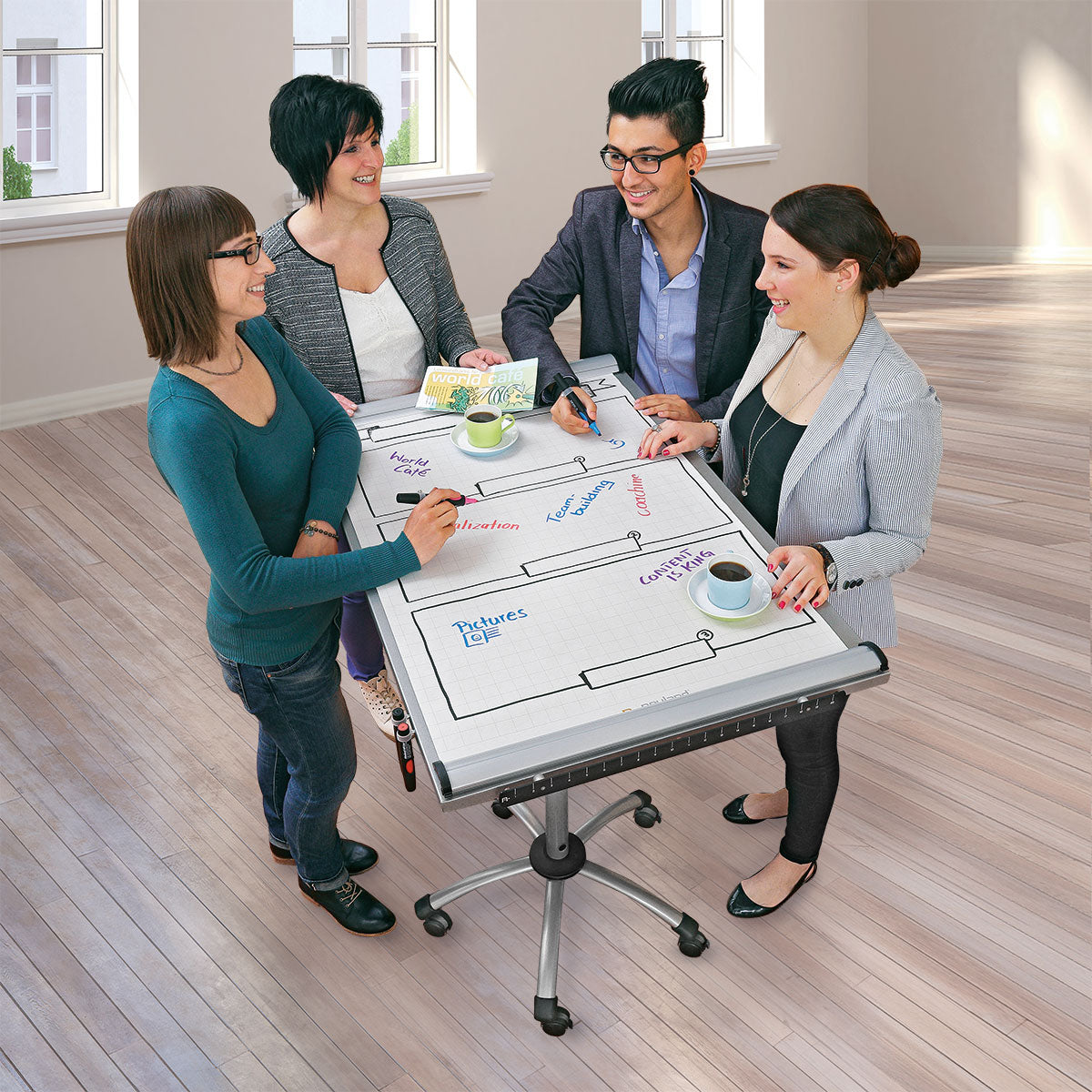 Das ideale Werkzeug zum Präsentieren, Querdenken, Visualisieren und Kommunizieren - dank der ausgefeilter Dreh- und Neigetechnik kombiniert mit einer Höhenverstellung. - stufenlos höhenverstellbar - drehbar (90°) - stufenlos neigbar (180°) - magnetisch - ready for ringos - klappbare Stiftablage - Komfort-Blockhalter Gesamtgröße: B 72 x H 150 - 190 x T 63 cm, Tafelfläche: B 72 x H 103,5 x T 2,7 cm Arbeitsfläche: B 72 x H 91 cm Tischposition: H 110 - 140 cm Gewicht: ca. 20 kg