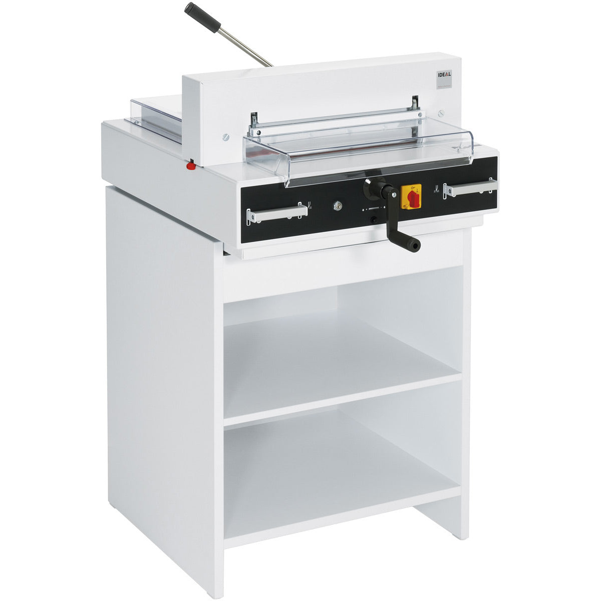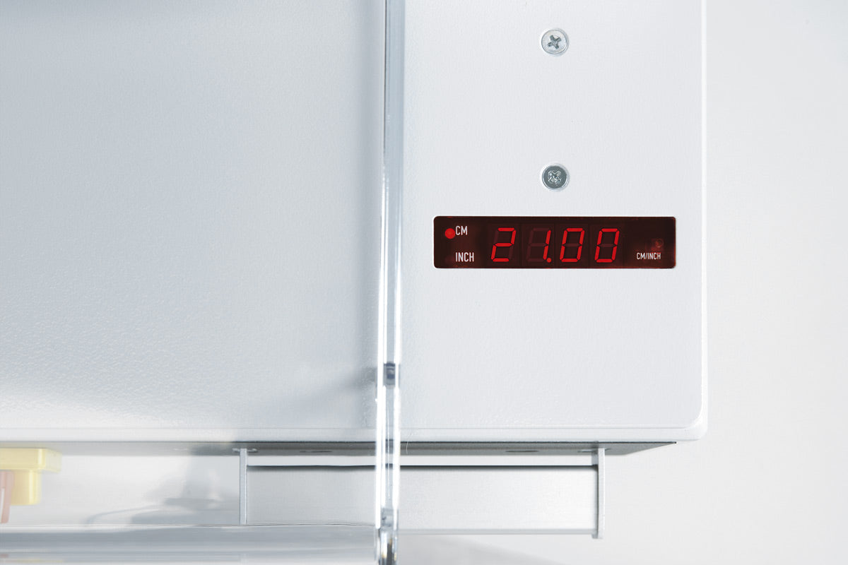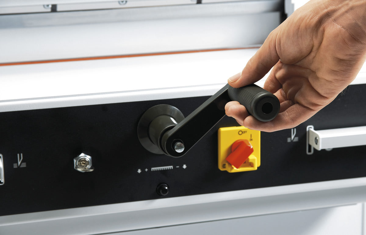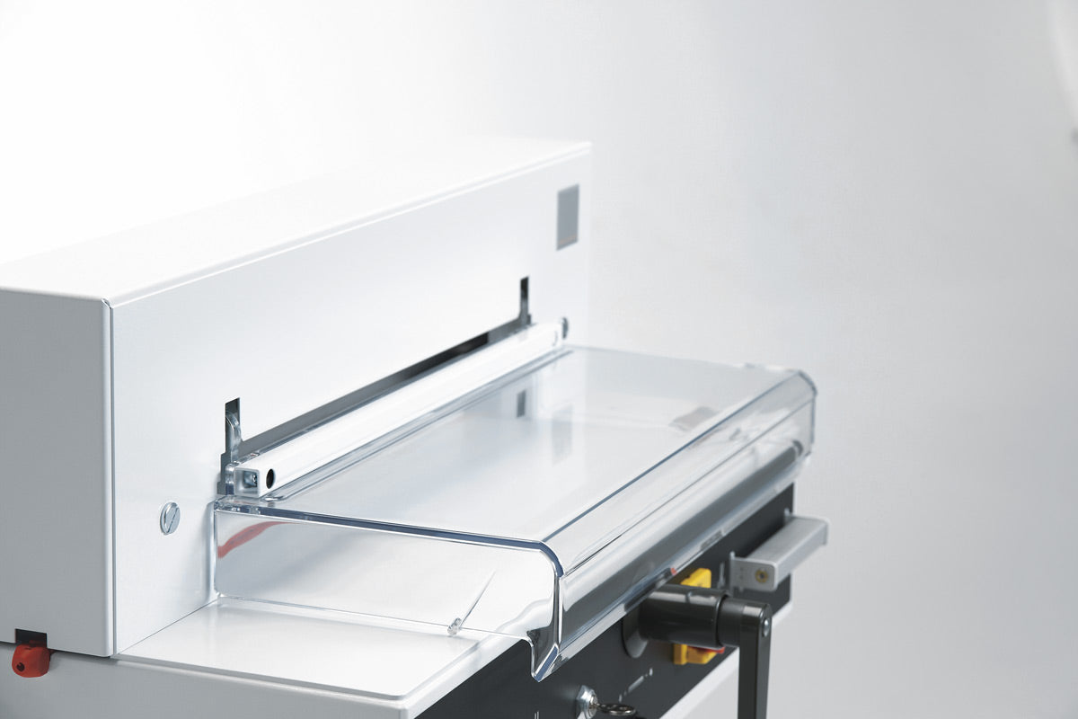 Komfortabler, elektrischer Büro-Stapelschneider mit 430 mm Schnittlänge und patentierter EASY-CUT Schnittauslösung. Besonders sicher durch „SCS“ (Safety Cutting System): Schwenkbare, transparente Sicherheitsvorrichtung auf dem Vordertisch (wird während des Schneidens automatisch verriegelt).