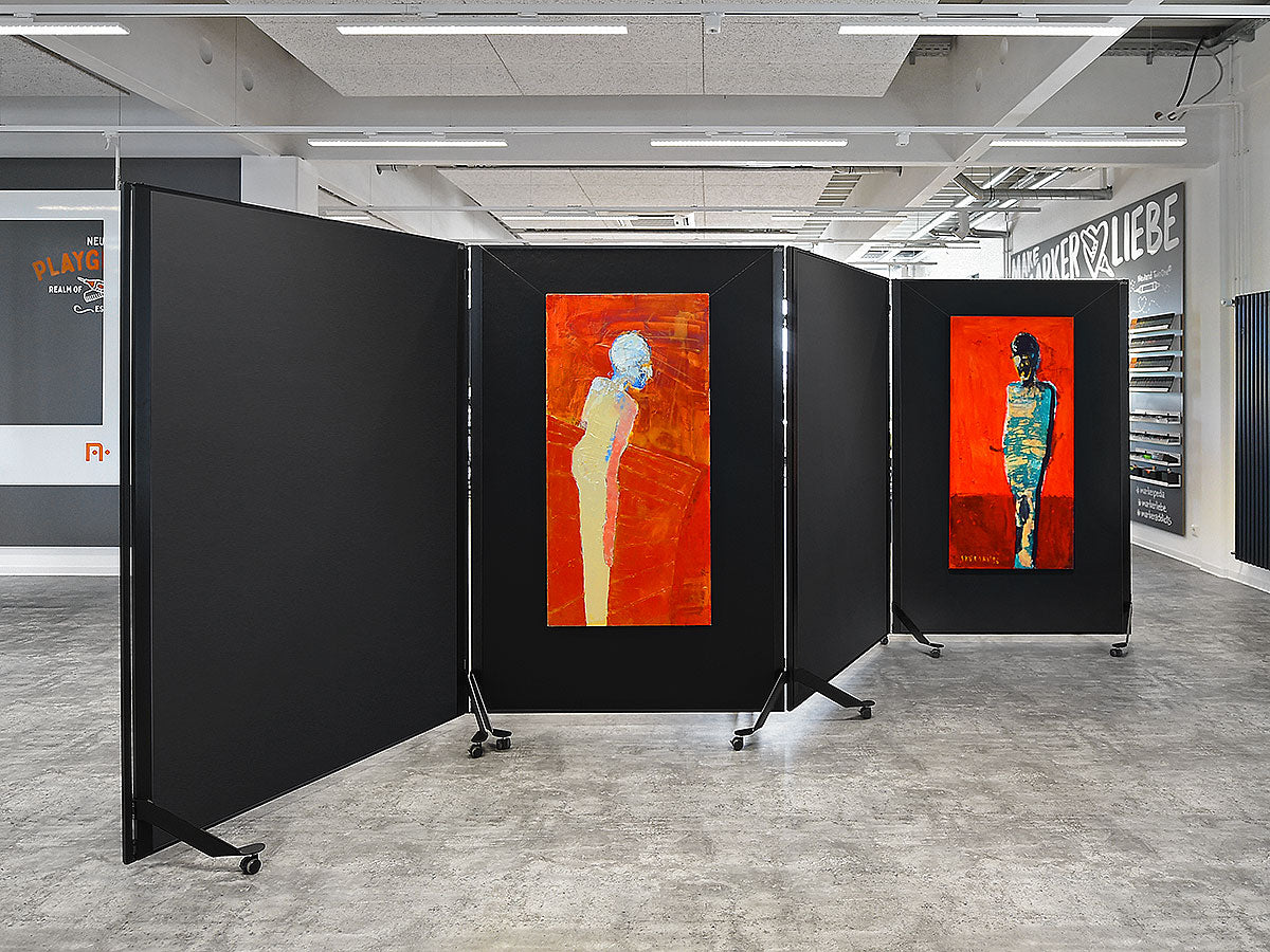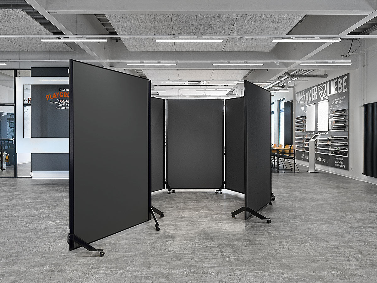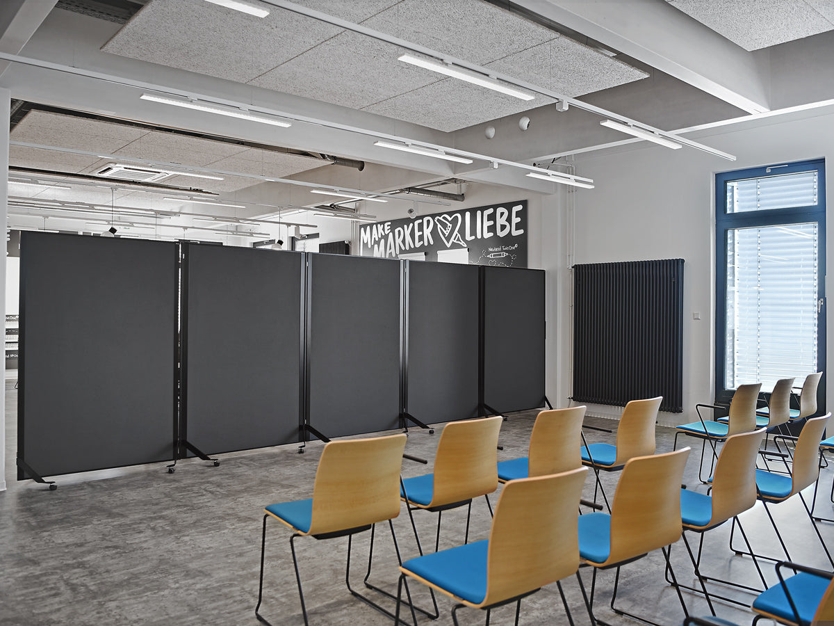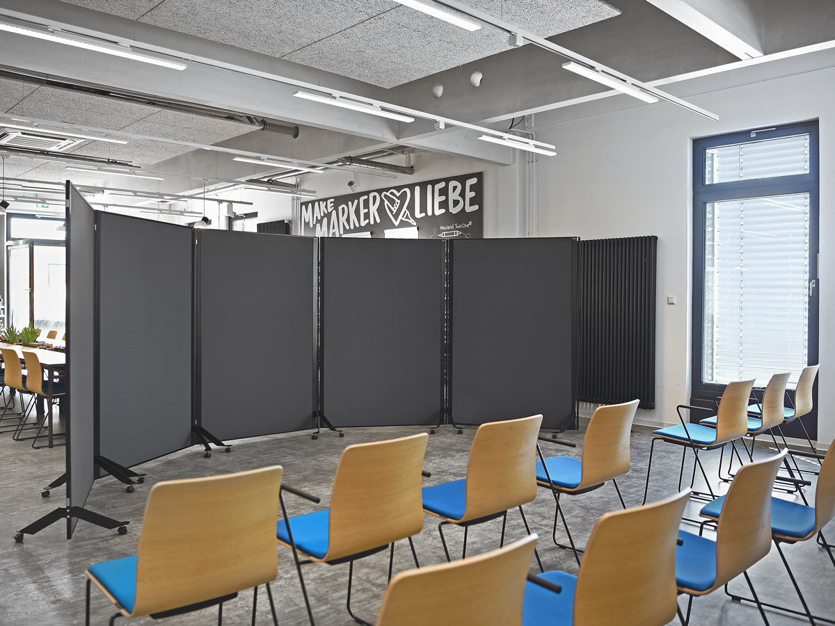 Cleveres, magnetisch verkettbares und fahrbares Tafelsystem. Metall-Ausführung: S002 Tiefschwarz matt, pulverbeschichtet Tafel-Ausführung: 15 mm Hartschaum, kaschiert mit Filztuch 9315 Schwarz Aluminiumrahmen, Stahlscharnier und Stahlfüße, schwarz pulverbeschichtet Lenkrollen, Kunststoff, feststellbar, inkl. Einzelfuß-Rolle Gesamtgröße (BxHxT): 131 x 195 x 59 cm Arbeitsfläche (BxH): 118,5 x 187 cm Gewicht: 12,5 kg (beidseitig Filz) pinGo® von Neuland ist das ultimative Tafelsystem für Meetings, Workshops, Ausstellungen, Konferenzen ... Dank des ausgefeilten, magnetischen Scharnier-Elements können einzelne Tafeln sekundenschnell magnetisch miteinander gekoppelt und dann auch bewegt werden. Ob Tafeln in Reihe, Wellenform oder im Bogen - all diese Formationen sind sekundenschnell gestellt und auf Wunsch genauso schnell wieder veränderbar.