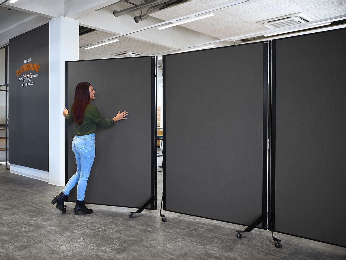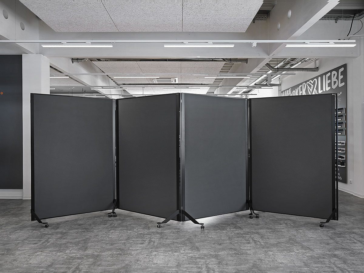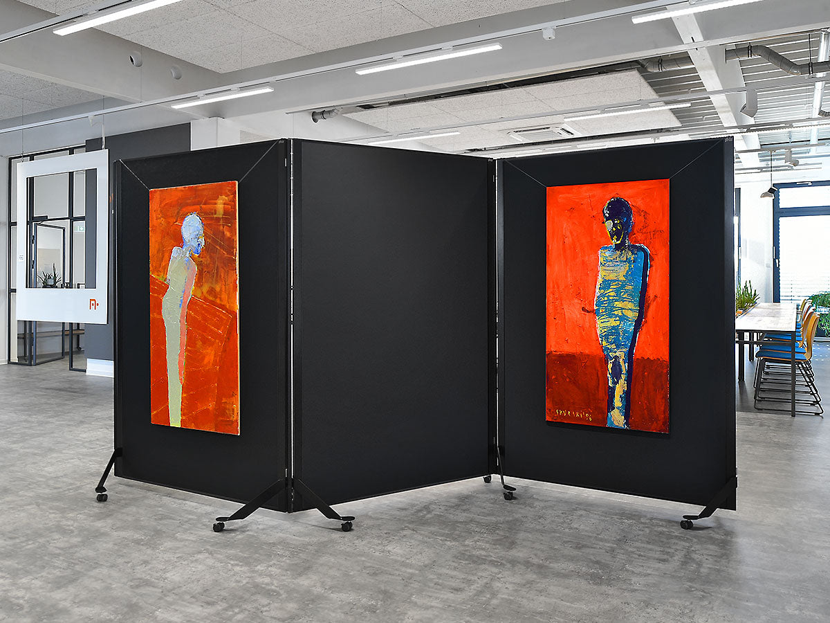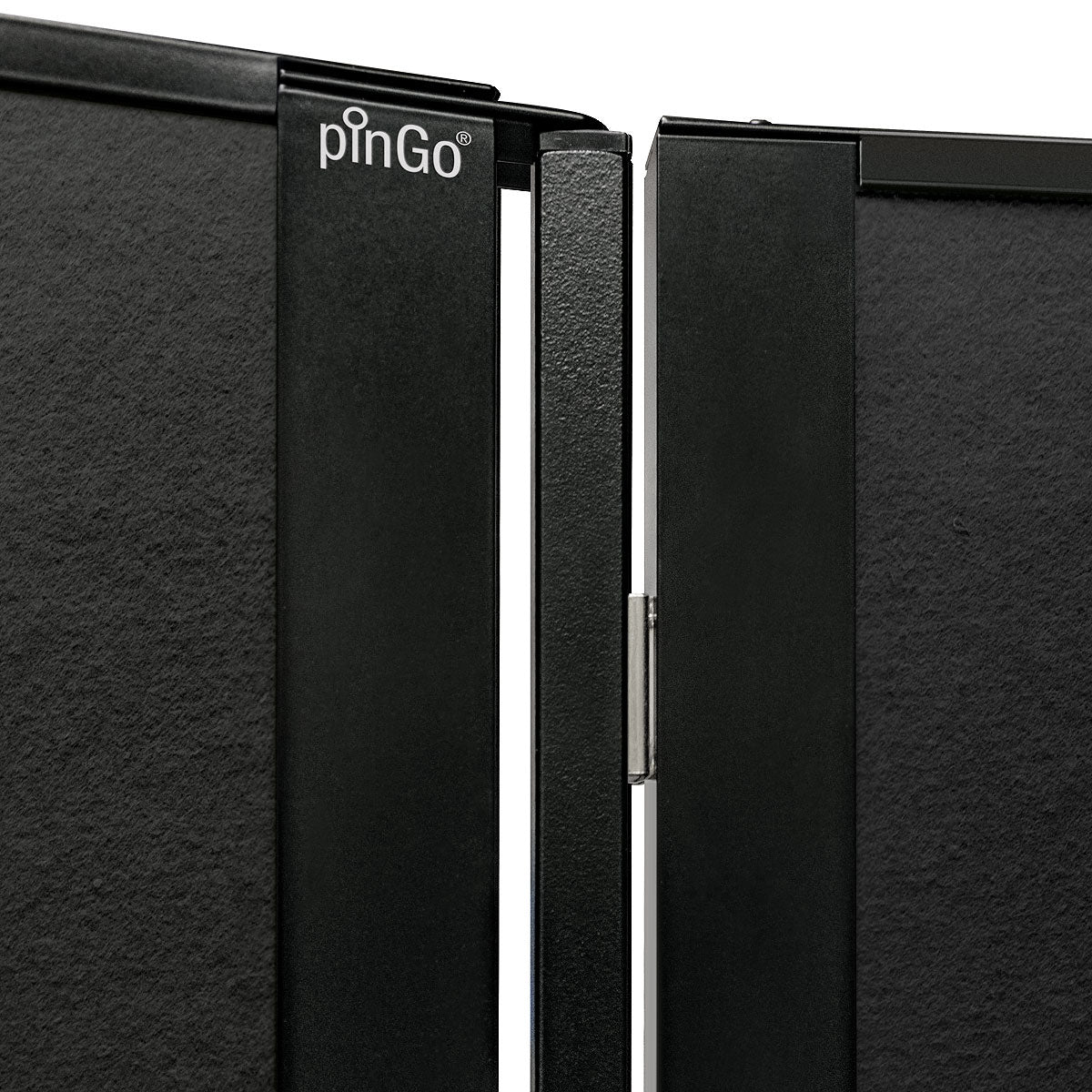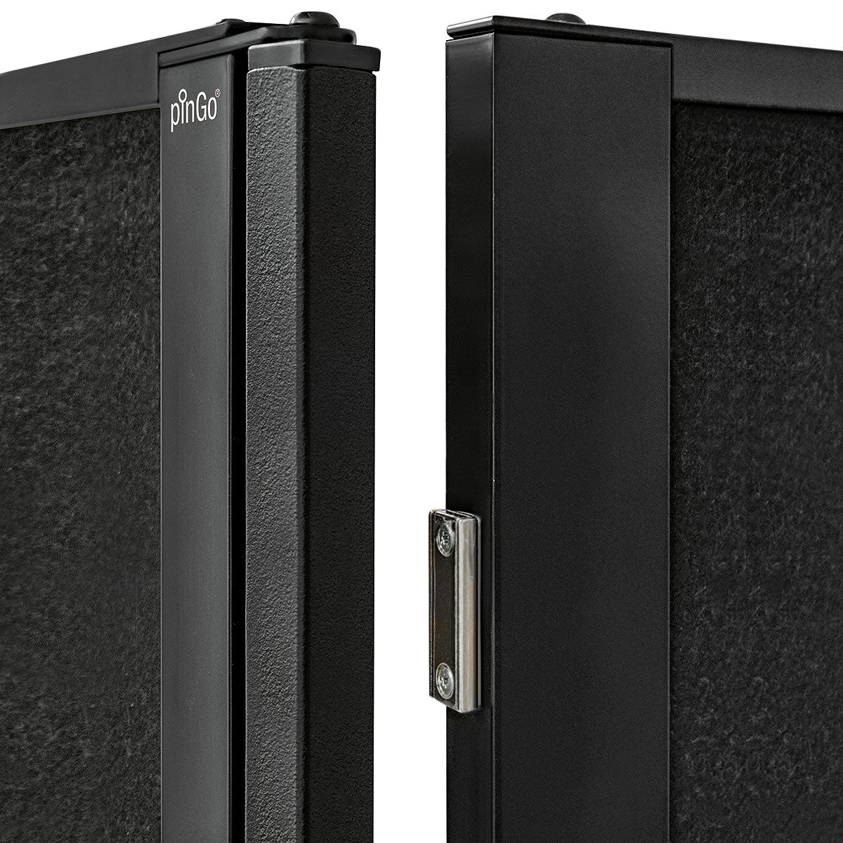 Cleveres, magnetisch verkettbares und fahrbares Tafelsystem. Metall-Ausführung: S002 Tiefschwarz matt, pulverbeschichtet Tafel-Ausführung: 15 mm Hartschaum, kaschiert mit Filztuch 9315 Schwarz Aluminiumrahmen, Stahlscharnier und Stahlfüße, schwarz pulverbeschichtet Lenkrollen, Kunststoff, feststellbar, inkl. Einzelfuß-Rolle Gesamtgröße (BxHxT): 131 x 195 x 59 cm Arbeitsfläche (BxH): 118,5 x 187 cm Gewicht: 12,5 kg (beidseitig Filz) pinGo® von Neuland ist das ultimative Tafelsystem für Meetings, Workshops, Ausstellungen, Konferenzen ... Dank des ausgefeilten, magnetischen Scharnier-Elements können einzelne Tafeln sekundenschnell magnetisch miteinander gekoppelt und dann auch bewegt werden. Ob Tafeln in Reihe, Wellenform oder im Bogen - all diese Formationen sind sekundenschnell gestellt und auf Wunsch genauso schnell wieder veränderbar.