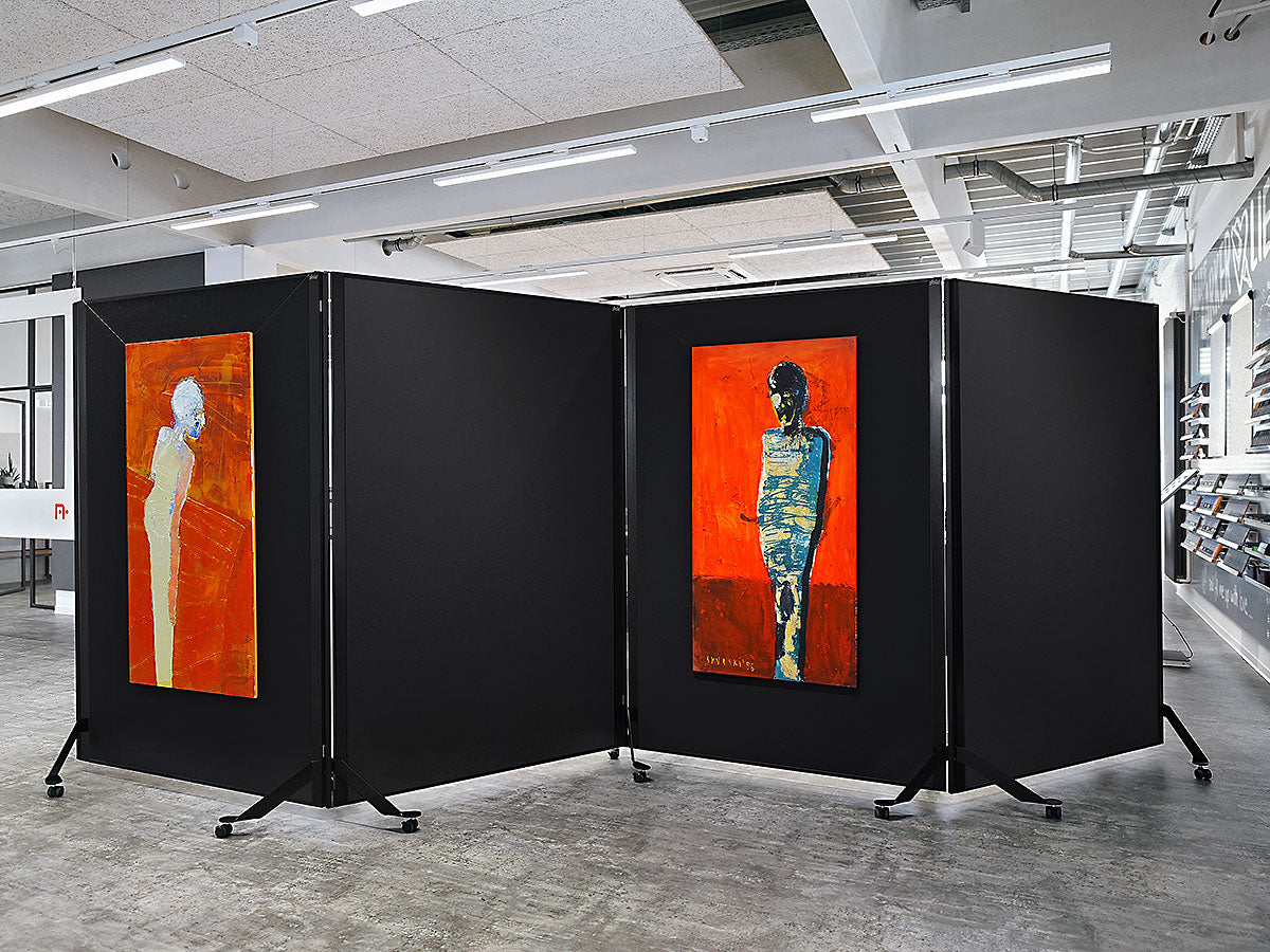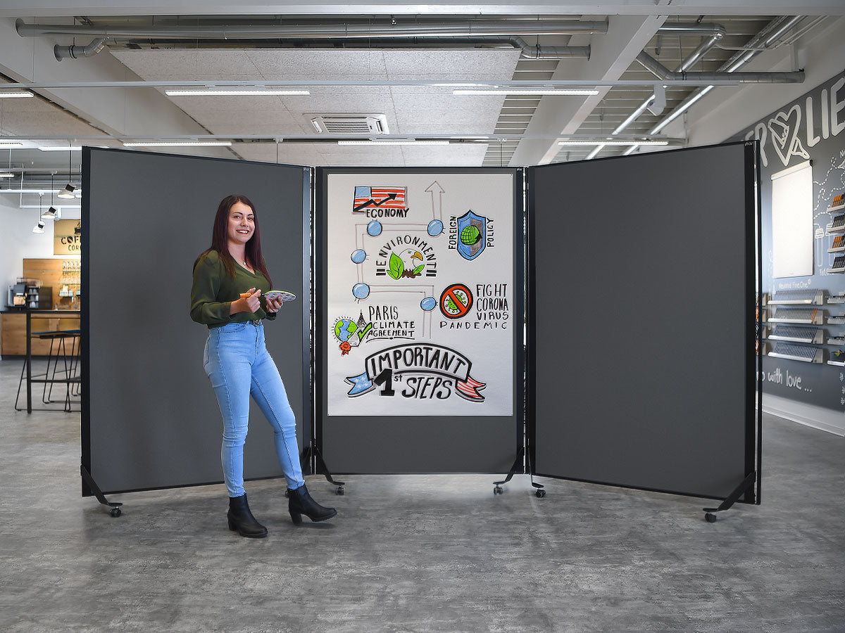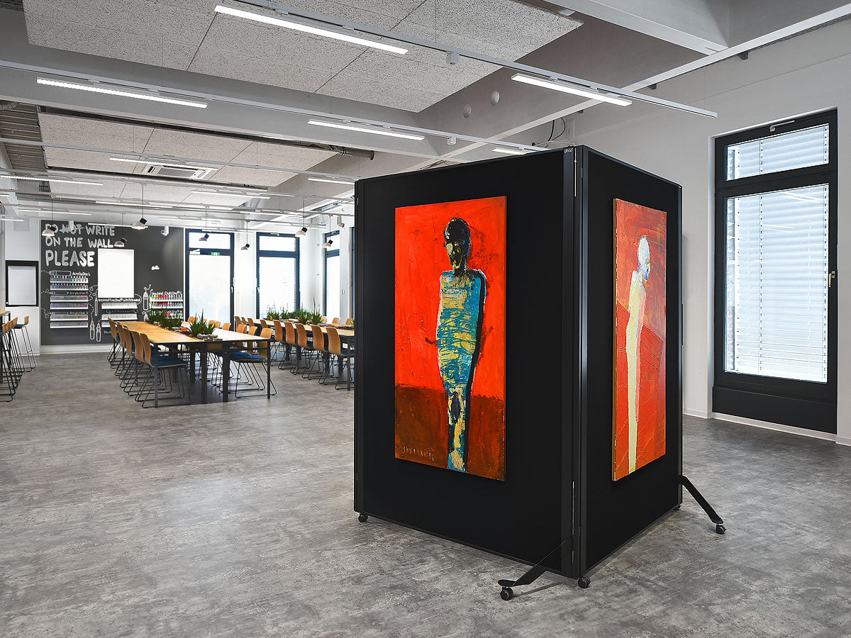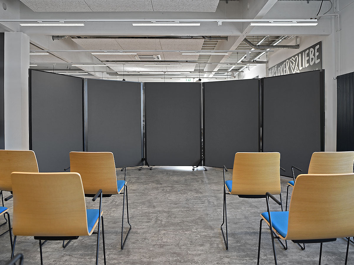 Cleveres, magnetisch verkettbares und fahrbares Tafelsystem. Metall-Ausführung: S002 Tiefschwarz matt, pulverbeschichtet Tafel-Ausführung: 15 mm Hartschaum, kaschiert mit Filztuch 9315 Schwarz Aluminiumrahmen, Stahlscharnier und Stahlfüße, schwarz pulverbeschichtet Lenkrollen, Kunststoff, feststellbar, inkl. Einzelfuß-Rolle Gesamtgröße (BxHxT): 131 x 195 x 59 cm Arbeitsfläche (BxH): 118,5 x 187 cm Gewicht: 12,5 kg (beidseitig Filz) pinGo® von Neuland ist das ultimative Tafelsystem für Meetings, Workshops, Ausstellungen, Konferenzen ... Dank des ausgefeilten, magnetischen Scharnier-Elements können einzelne Tafeln sekundenschnell magnetisch miteinander gekoppelt und dann auch bewegt werden. Ob Tafeln in Reihe, Wellenform oder im Bogen - all diese Formationen sind sekundenschnell gestellt und auf Wunsch genauso schnell wieder veränderbar.